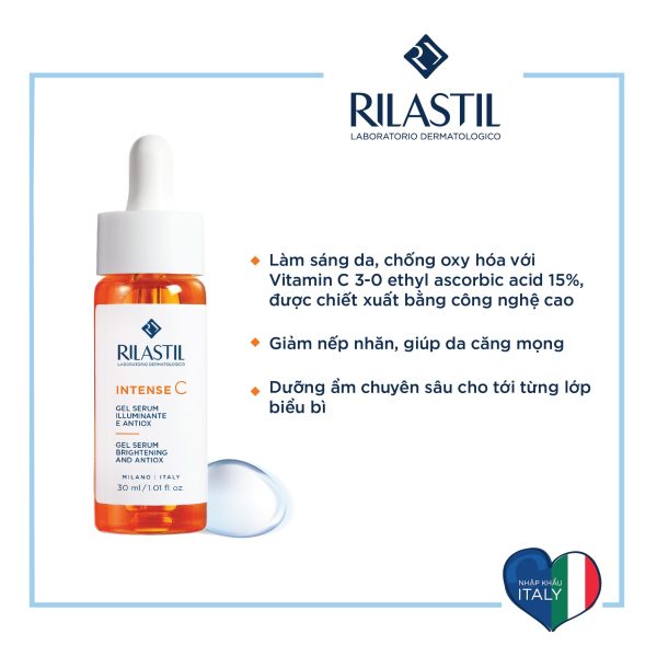 Rilastil Intense C Gel Serum 30ml là loại huyết thanh hoàn hảo cho mọi loại da, với 15% Vitamin C hi-tech (chiết xuất công nghệ cao) sản phẩm này có tác dụng chống lão hóa, cấp ẩm sâu cho da và giúp da được bảo vệ tốt hơn trước tác hại của tia UV. Ngoài ra, còn ngăn ngừa sự xuất hiện của nếp nhăn, làm đều màu da, tăng sinh Collagen và giúp da trở nên sáng mịn, căng bóng.